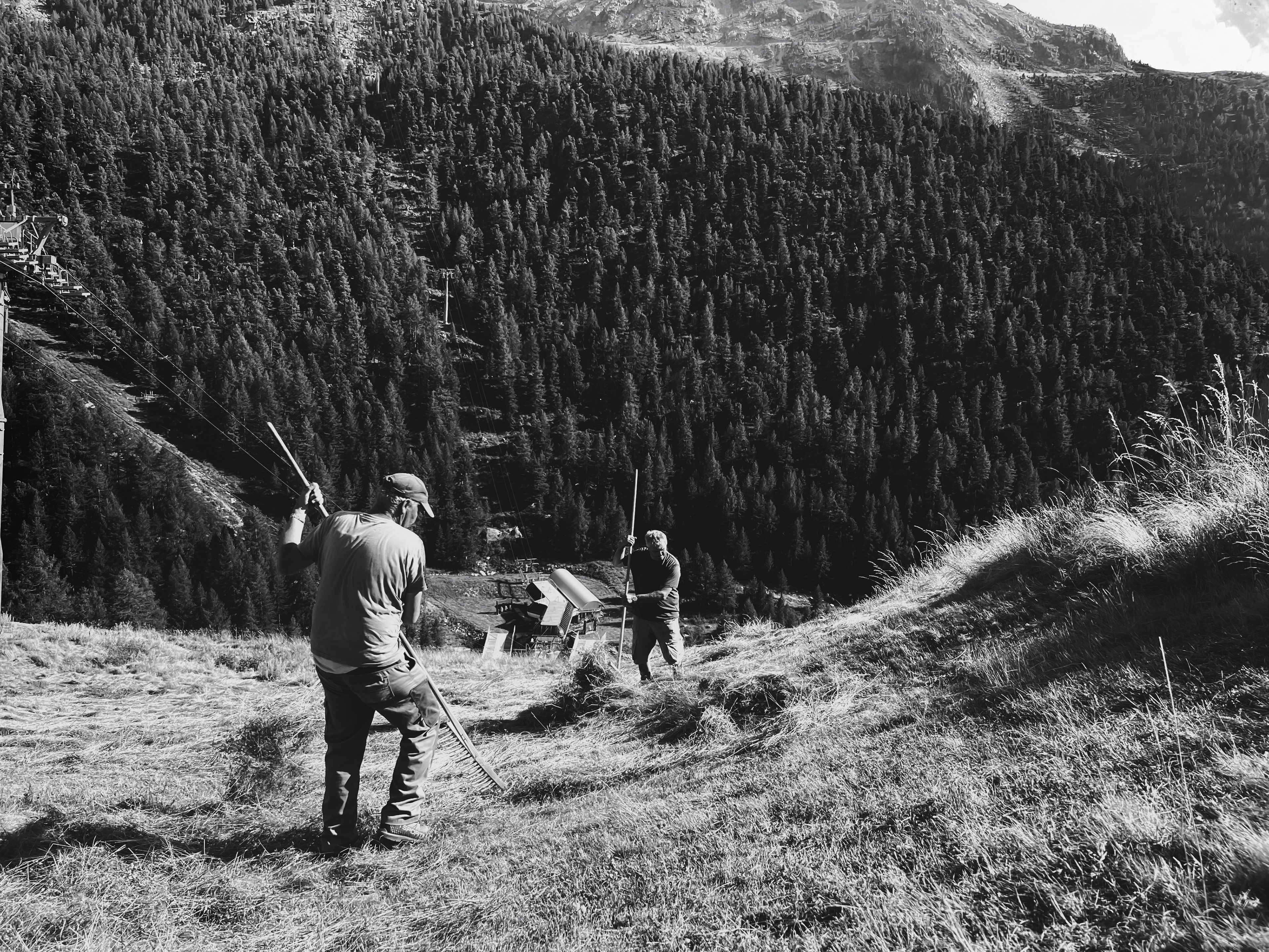 Andreas et Urban ramassent au râteau l'herbe fauchée