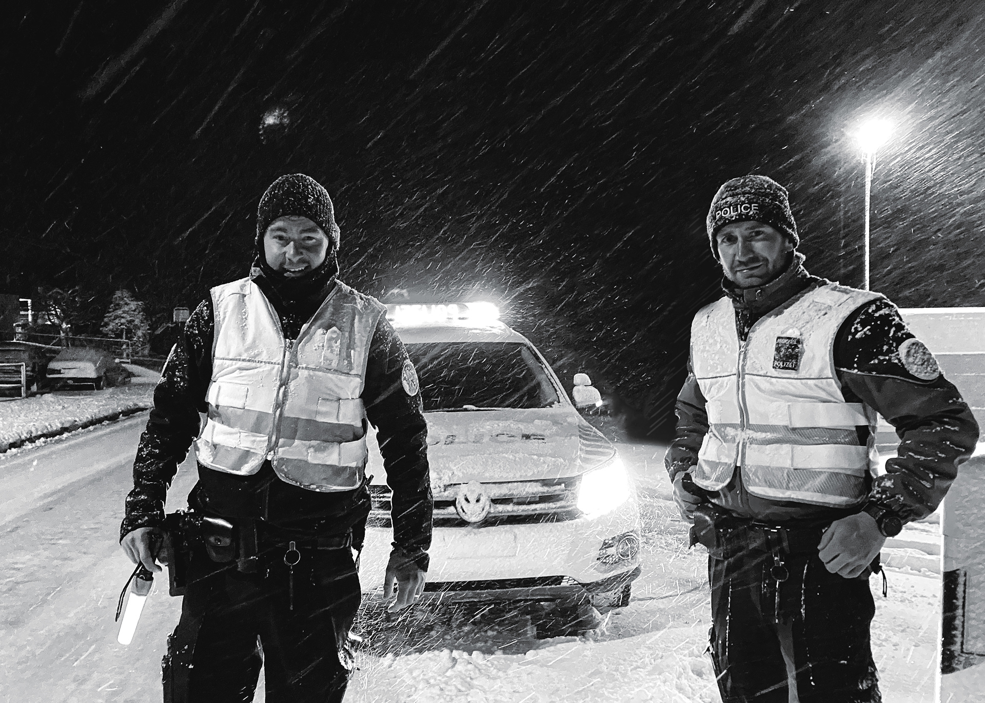 L'accès routier à Zermatt étant bloqué par une gigantesque tempête de neige, les policiers Philippe Roth et Gian Luca Burkard gèrent la circulation dans un froid glacial.